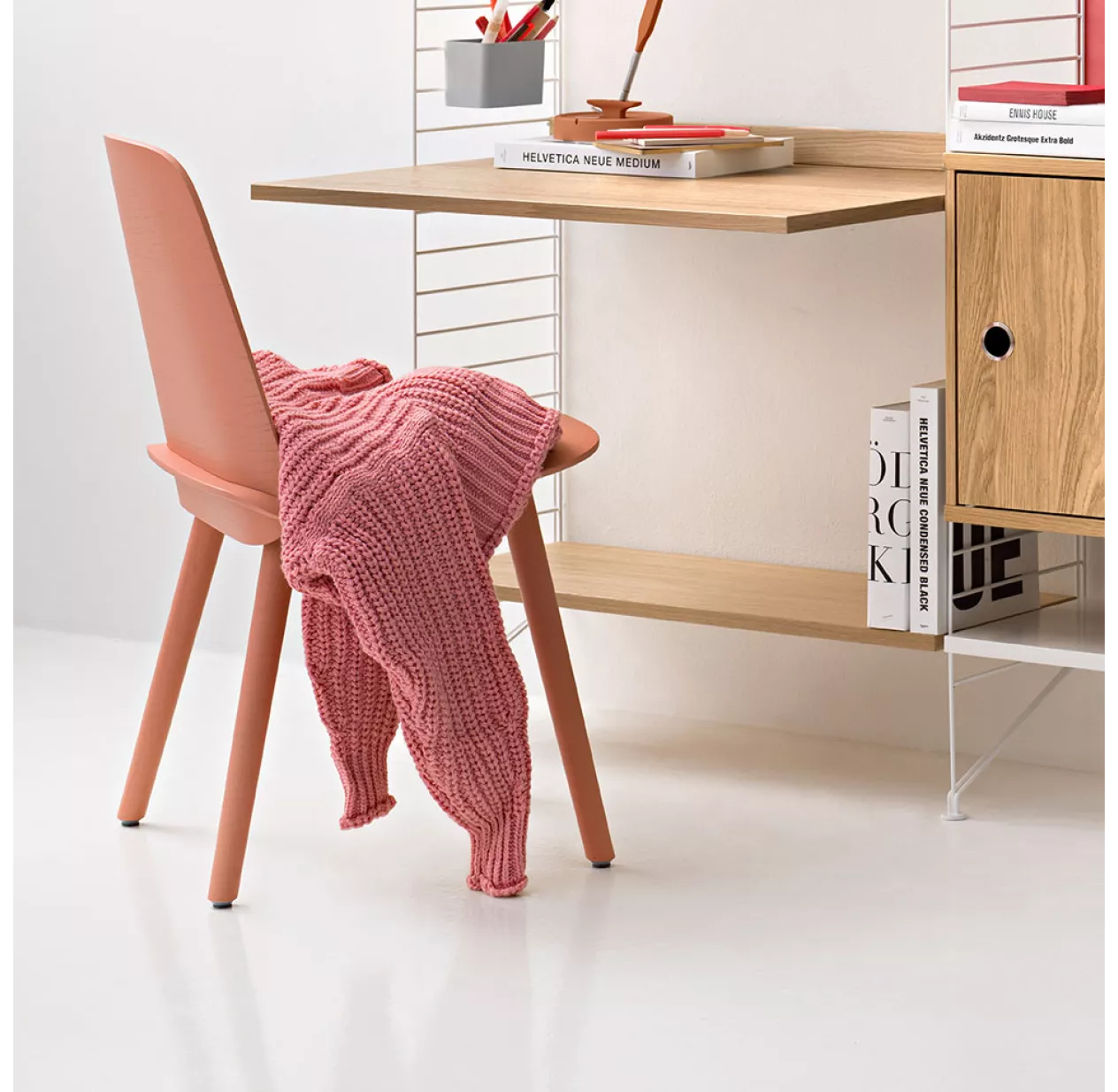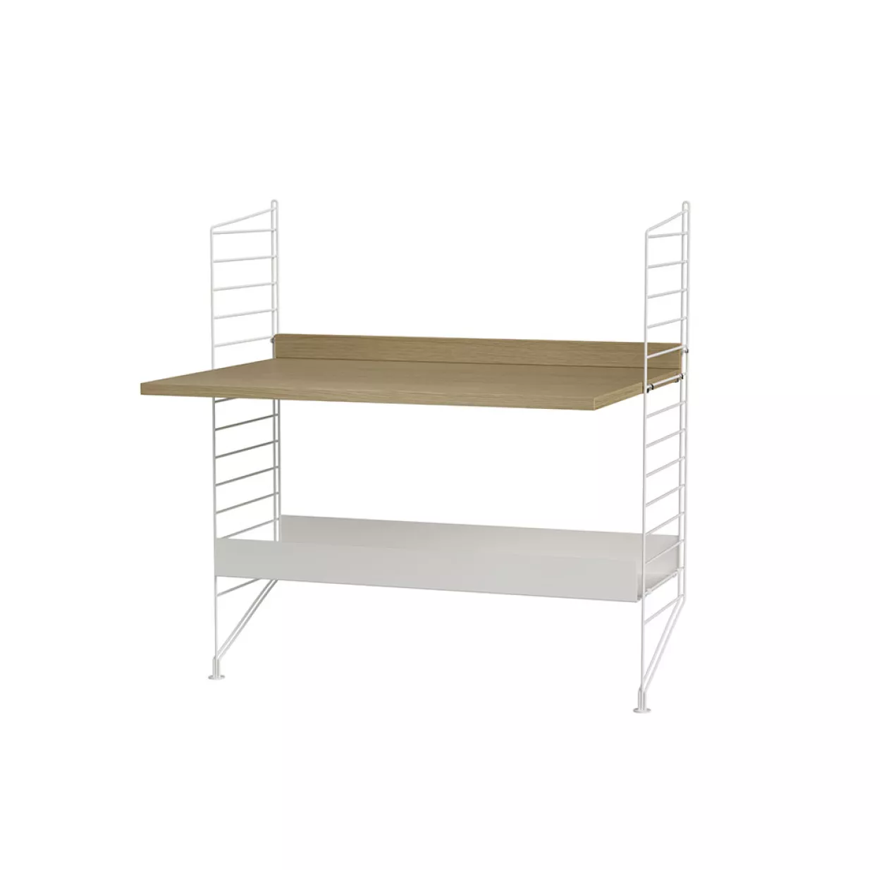 Vous pouvez aussi composer votre bureau STRING dans d’autres finitions: chêne, noyer, gris ou noir laqué…