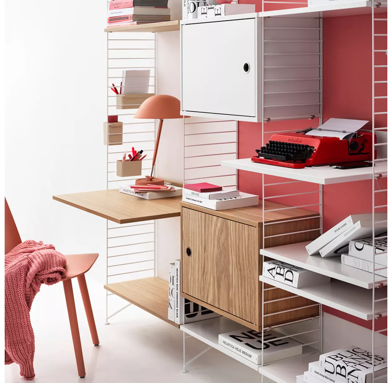 Vous pouvez également rajouter les étagères pour magazines, les étagères métalliques ou en bois, le plateau de bureau et tous les autres rangements modulables String. Vous pouvez aussi mélanger les couleurs.