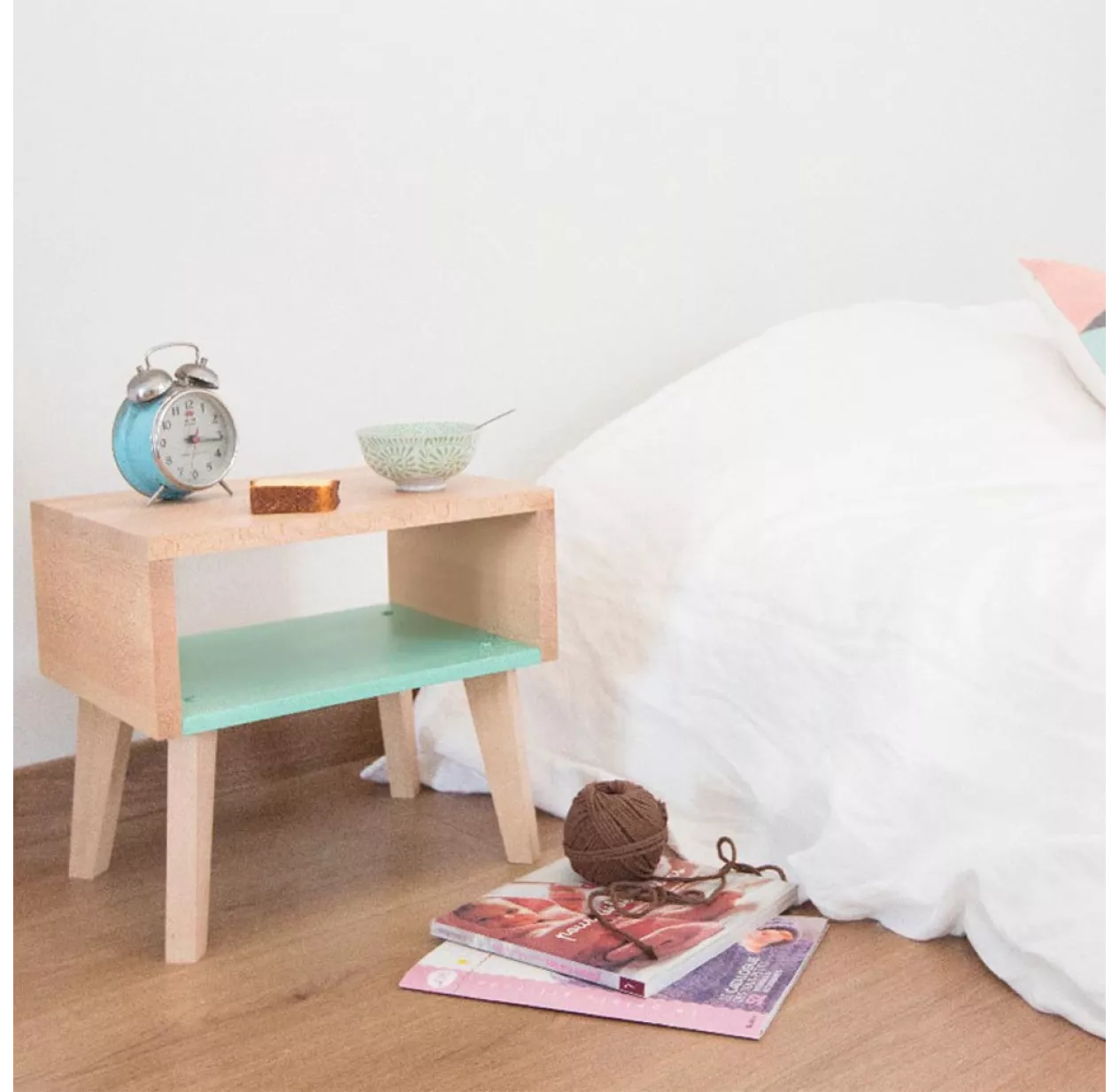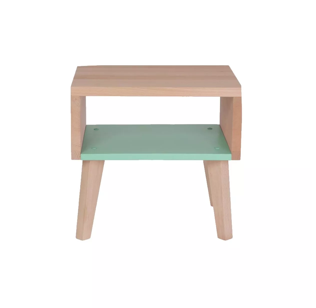 Chevet ou bout de canapé en hêtre. Son style design et retro à la fois conviendra dans tous les intérieurs. Plateau supérieur verni avec un vernis à l’eau ecolabel très résistant. Le plateau du casier coloré est en contreplaqué de bouleau peint.
