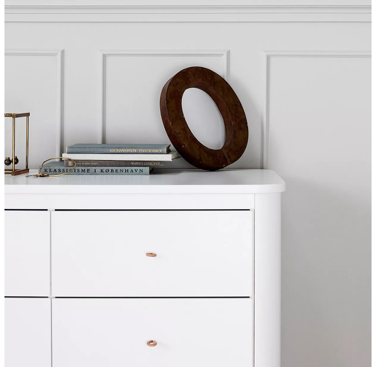 La commode est disponible avec les pieds en chêne massif ou en bouleau laqué blanc. Vous avez la possibilité de rajouter le petit plan à langer Wood ou le grand plan à langer Wood d’Oliver Furniture, disponibles en option.