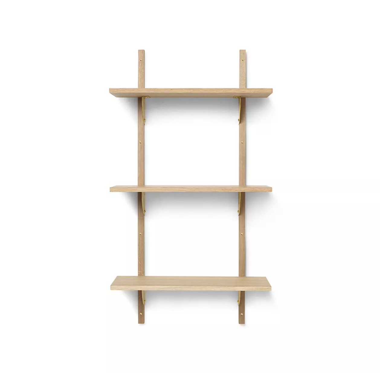 Le système modulaire Sector revisite l’étagère murale du milieu du siècle dans une version moderne et fonctionnelle. L’étagère Sector affirme une simplicité robuste dans un esprit naturel et minimaliste. Dans cette version Small et triple, l’étagère Sector associe placage de chêne naturel et laiton. Elle est aussi disponible en placage de frêne teinté noir et ses supports en laiton poli existent également en laiton noirci. L’étagère Triple Sector de Ferm Living se fixe au mur avec des montants en bois massif et des vis apparentes. Elle est idéale pour mettre en scène vos objets préférés dans une chambre enfant, un salon, des plantes ou des pots de rangement dans une cuisine. Elle s’associe parfaitement au bureau mural Sector qui se décline dans les mêmes couleurs et finitions.